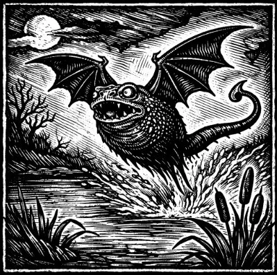 In Welsh, Llamhigyn y Dŵr (pronounced Hlam-HIG-in uh DOOR) literally means “Water Leaper”. It is said to resemble a large and monstrous toad, limbless except for membranous, bat-like wings which it uses to glide when it springs from the water at its prey. It possesses a long tail tipped with a cruel, venomous-looking stinger.