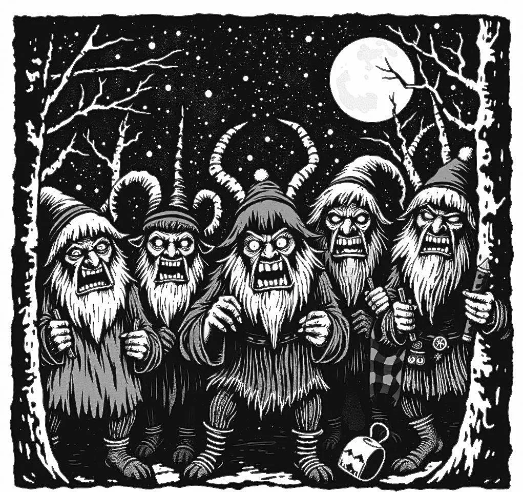 The Child would be found in the morning, cowering in their bed, insisting that they would be good from now on, knowing the terrible fate that would await them should Crom Dubh na Nollaig be forced to return for a second time.