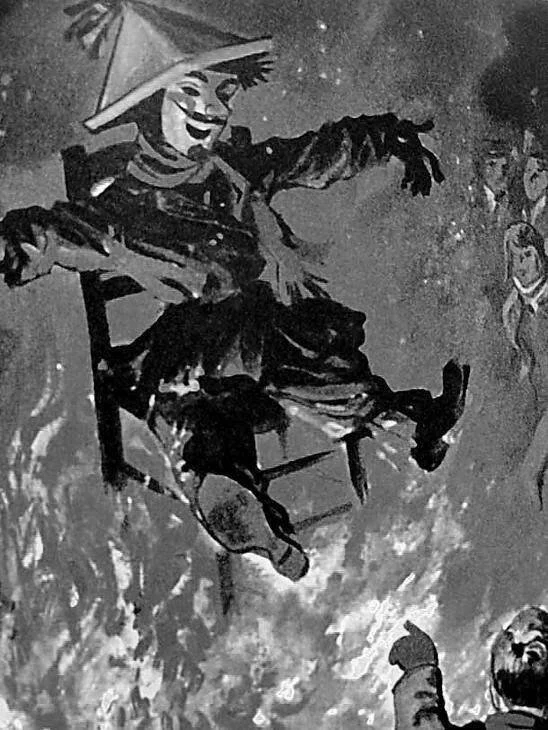 A Bonfire, on which burns the effigy of Guy Fawkes.