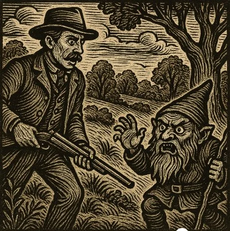Happy to have deceived the dwarves he called out, mocking them (very unwise) in a moment he found himself surround by a group of mean looking Duergar, all carrying clubs, he fainted in shock. When he woke the dwarves had gone, and badly shaken, he made his way home.